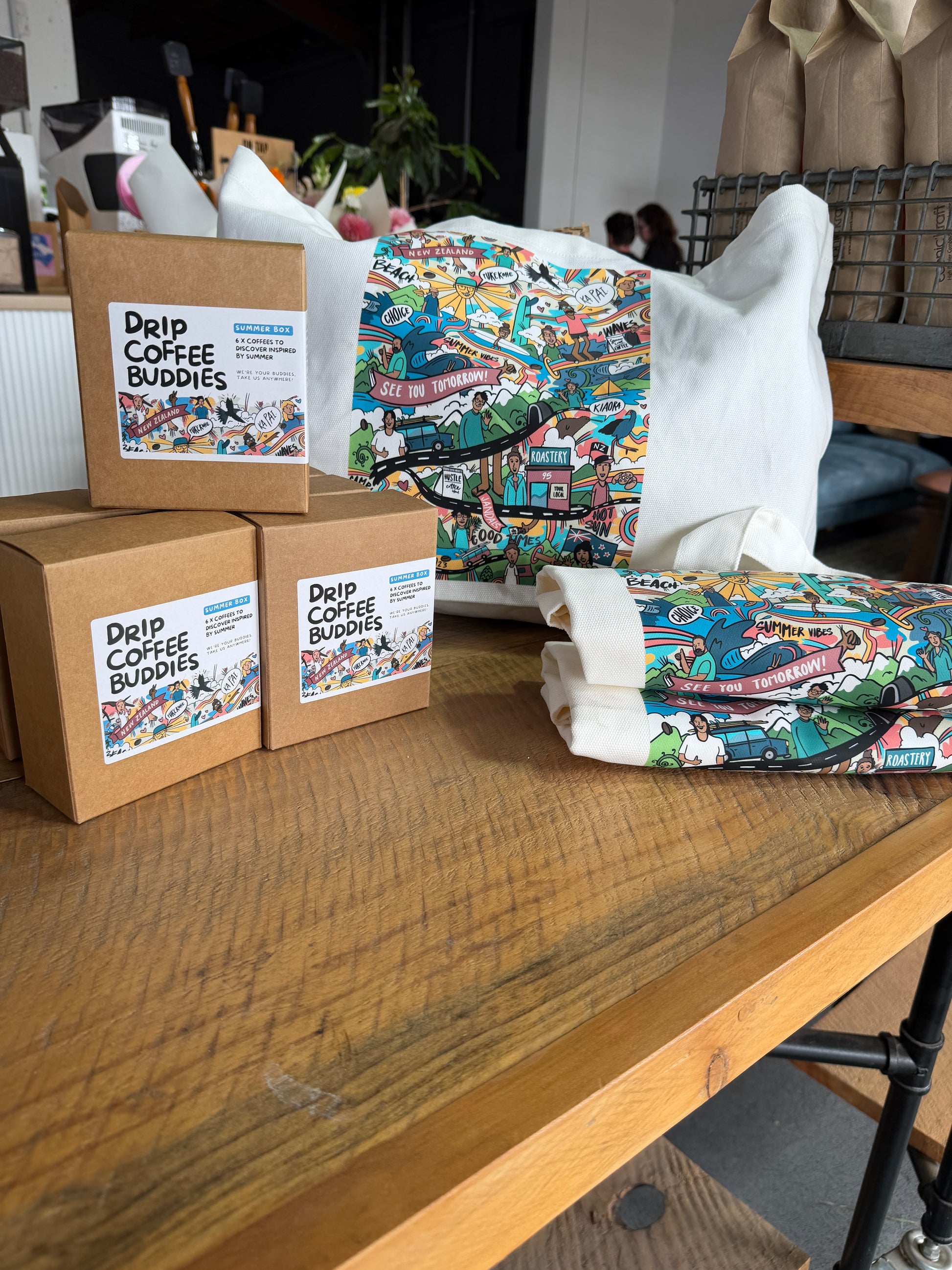 Featuring art work done in collaboration with artist Allan Wrath, this beach bag is inspired by vibrant summer in Franklin — whether it’s catching the waves at Sunset Beach, picnics in Kariotahi, and those coffee catch-ups at Your Local.